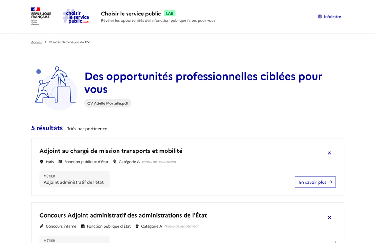 En créant des solutions co-construites avec les publics aspirant à choisir le service public et les professionnels et acteurs du recrutement dans la fonction publique, nous assistons les candidat(e)s potentiel(le)s à explorer, mieux comprendre et trouver plus aisément leur voie au sein du service public. Notre approche s'inscrit dans une logique d'innovation visant à renforcer l'attractivité de la fonction publique.